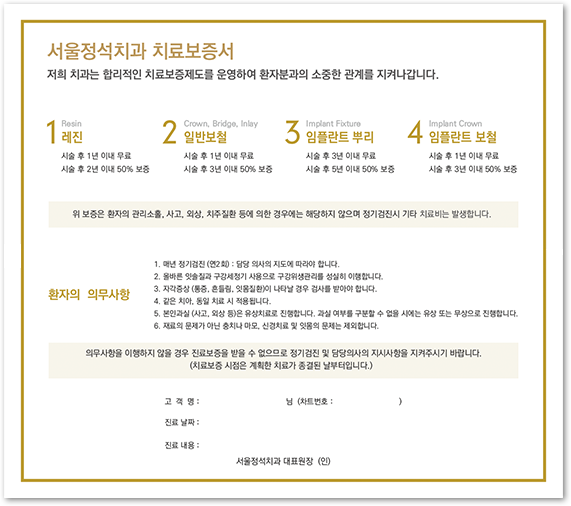서울정석치과는 합리적인 치료보증제도를 운영하여
